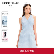 糖力商场同款 雾蓝裙 2026春新款细闪小香风X型无袖连衣裙女显瘦 蓝色 细闪混纺小香料 镂空蝴蝶结设计 S 建议95-105斤
